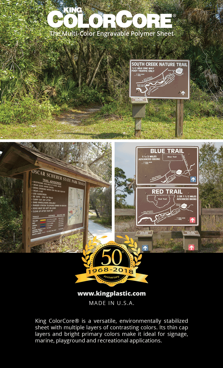 Oscar Scherer State Park trail signs are made using 3/4″ gauge 48″ x 96″ sheets of King ColorCore® in brown/white/brown color.