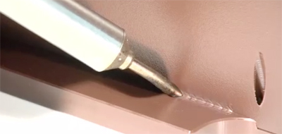 With speed welding, the plastic welder, similar to a soldering iron in appearance and wattage, is fitted with a feed tube for the plastic weld rod. The speed tip heats the rod and the substrate, while at the same time it presses the molten weld rod into position. A bead of softened plastic is laid into the joint, and the parts and weld rod fuse. With some types of plastic such as polypropylene, the melted welding rod must be \”mixed\” with the semi-melted base material being fabricated or repaired. These welding techniques have been perfected over time and have been utilized for over 50 years by professional plastic fabricators and repairers internationally. Speed tip welding method is a much faster welding technique and with practice can be used in tight corners. A version of the speed tip \”gun\” is essentially a soldering iron with a broad, flat tip that can be used to melt the weld joint and filler material to create a bond.