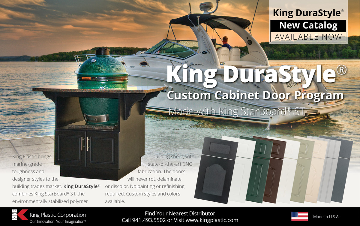 Today, King Plastic brings marine-grade toughness and designer styles to the building trades market. The King DuraStyle® Custom Cabinet Door Program combines King StarBoard® ST, the environmentally stabilized polymer building sheet, and state-of-the-art CNC fabrication. King DuraStyle® will never rot, delaminate or discolor. No painting or refinishing required. Custom styles, sizes and colors available.